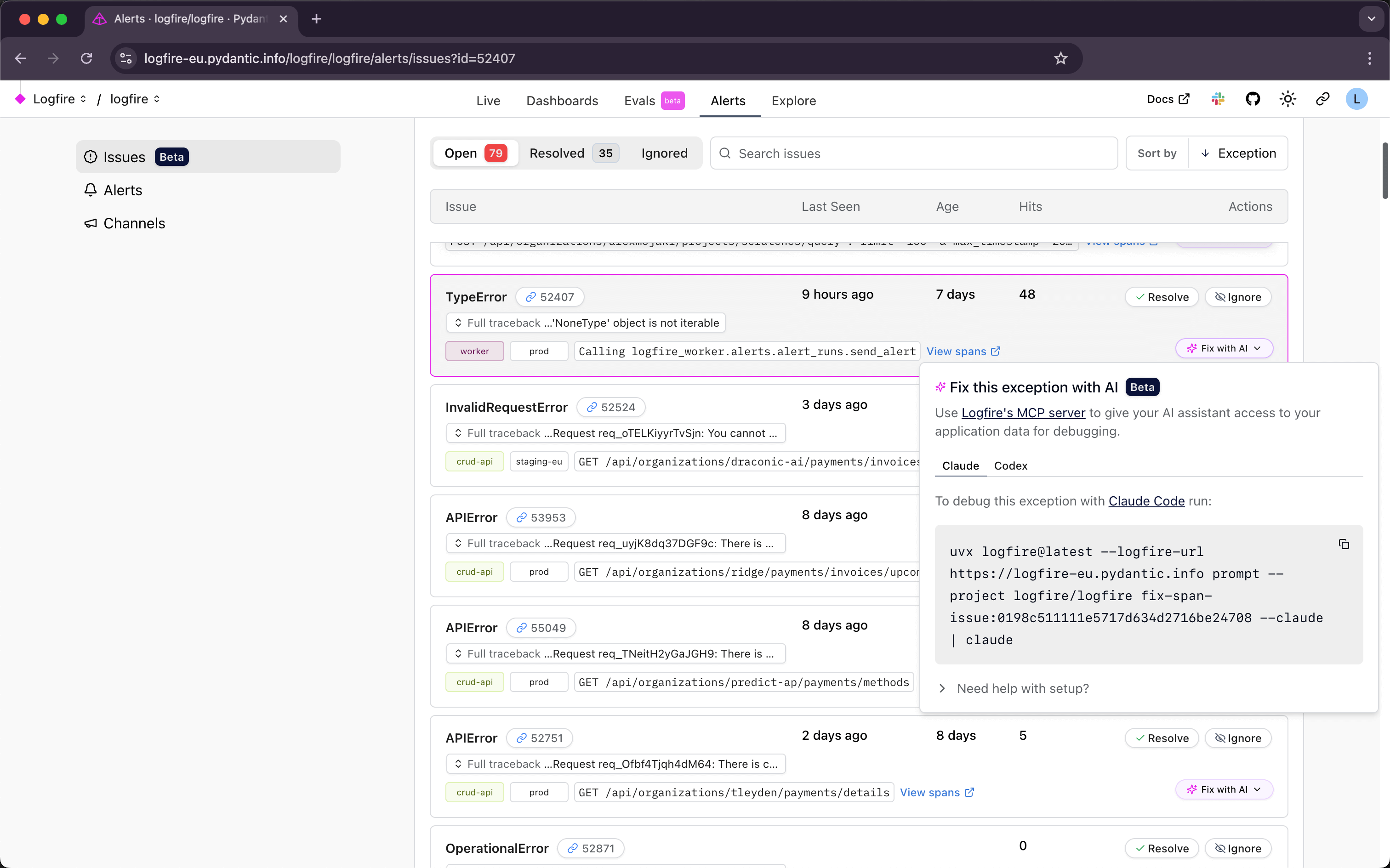 Use this feature to debug your exceptions using your local LLM coding tool plus the Logfire MCP server.